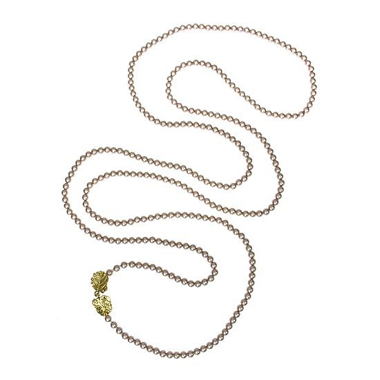 鍊身由水晶珍珠串連而成,項鍊末端綴以雅緻的葉片扣環設計,亦可依配戴者喜好與其他項鍊做多層次搭配,可繞成兩至三圈配戴,風格多變且實搭性高的水晶珍珠項鍊,是永不退潮流且女孩必備的時尚百搭單品。