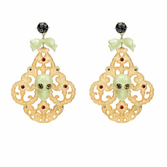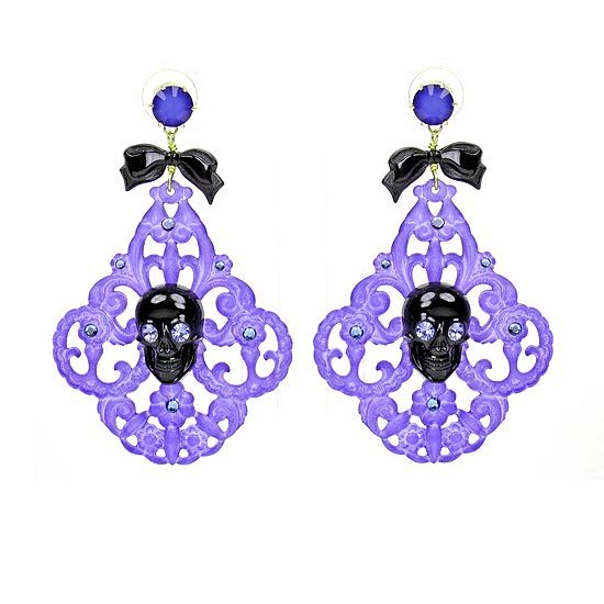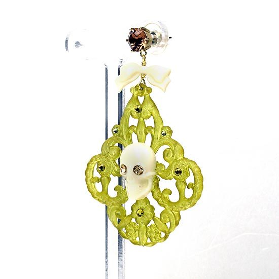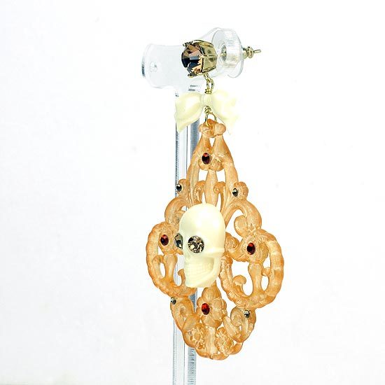 耳環以華麗造型的花朵圖騰墜飾為主體,與樹脂材質的蝴蝶結搭配,上方並綴有樹脂骷髏墜飾