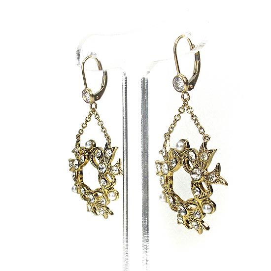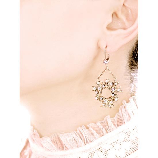 耳環以細膩的古典蝴蝶結花圈設計,上方並飾以水晶、珍珠點綴,典雅大方的耳環設計,襯托出時尚女孩的亮麗甜美風采,整體造型大為加分!