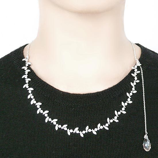 頸鍊鍊身以薔薇的藤蔓葉片為設計概念,以細緻夾鑲圓形鋯石點綴,呈現精緻度的質感,頸鍊旁並綴有水滴形SWAROVSKI水晶,隨著身體擺動,呈現出女性的風情萬種,無論平日裝扮派對造型均十分百搭。