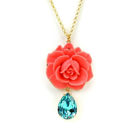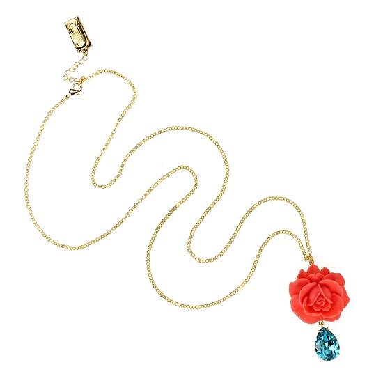 鍊身為合金鍍18K金材質;水晶部分採用Crystallized-施華洛世奇元素;鍊子總長為30英吋;延長鍊1.1/2英吋;手工樹酯薔薇尺寸約為32mm ×30mm;水滴形水晶尺寸為17mm ×12mm