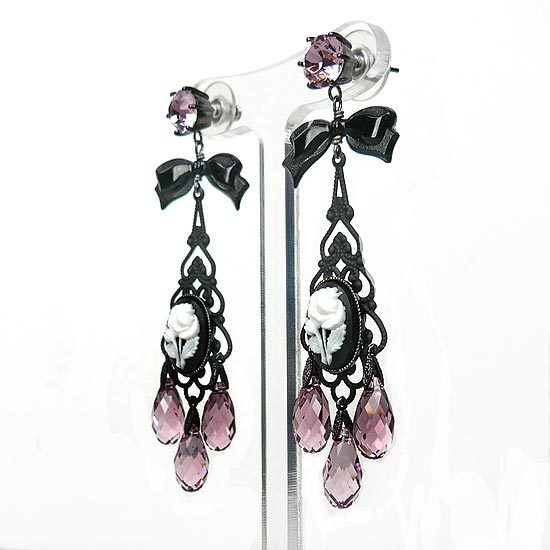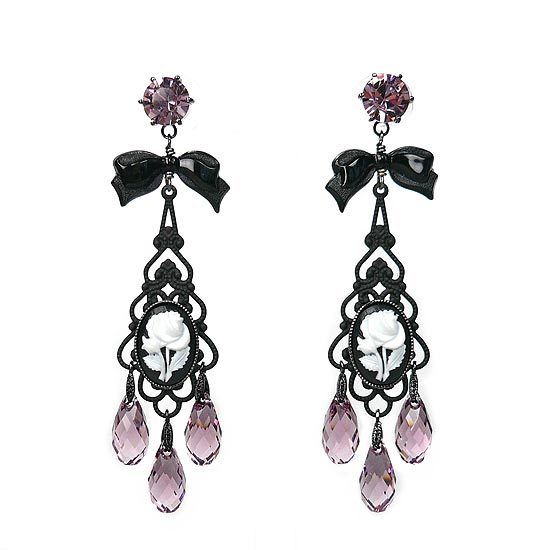 耳環墜飾以樹脂材質的蝴蝶結墜飾結合哥德式風格圖騰造型座臺與薔薇浮雕墜飾,下方並綴有水滴形紫色SWAROVSKI水晶,融合了哥德式的優雅華麗與浪漫情調,前衛與古典兼具並能修飾其臉型。