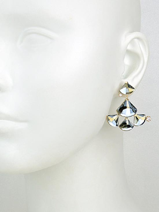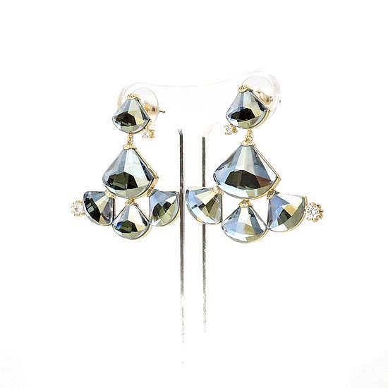 耳針為純銀鍍18K金材質;扇形水晶座臺為合金鍍18K金材質;水晶部分採用Crystallized-施華洛世奇元素;耳環總長為1 1/2英寸;水晶墜飾為25mm X 30mm
