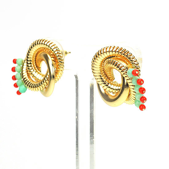 耳環的耳針部分為純銀鍍18K金;金屬座臺為合金鍍18K金材質;搭配玉石與日本彩珠;耳環尺寸約為1 x 7/8英吋。