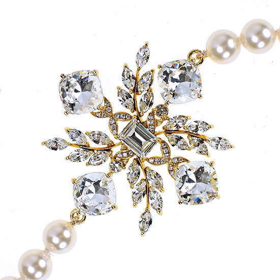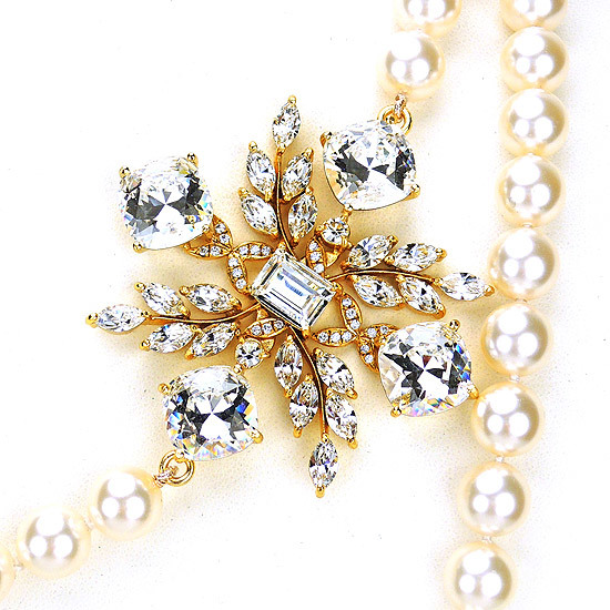鋯石與水晶鑲嵌的雪花墜飾;葉子扣頭為合金材質電鍍18K材質;扣頭為合金水晶及水晶珍珠部分採用Crystallized-施華洛世奇元素