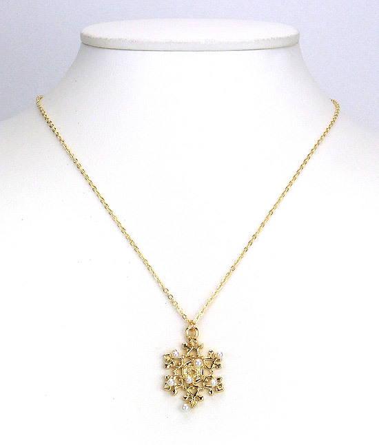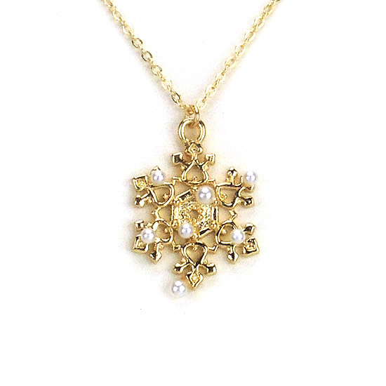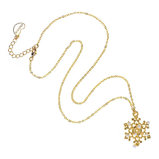 雪花墜飾合金鍍18K金材質;頸鍊材質合金鍍18K金材質;水晶珍珠為Crystallized-施華洛世奇元素;頸鍊總長為17英吋;雪花墜飾尺寸為1x1英吋。