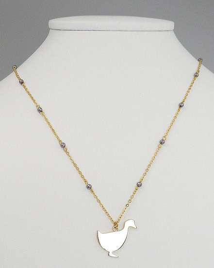 純銀鍍18K金鴨子墜飾,以及鍍金鍊子搭配紫色珍珠裝飾。